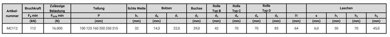 Die nach DIN 8168 gefertigten Hohlbolzenförderketten MC112 gibt es in den Teilungen 100, 125, 160, 200, 250 und 315 sowie mit und ohne Rollen. Andere Abmessungen z.B. lichte Weite, Teilung, Laschenabmessungen, Gelenkteildurchmesser auf Anfrage.
