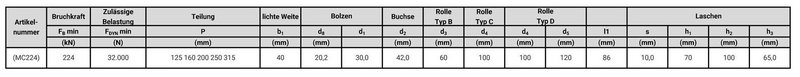 Die nach DIN 8168 gefertigten Hohlbolzenförderketten (MC224) gibt es in den Teilungen 125, 160, 200, 250 und 315 sowie mit und ohne Rollen. Andere Abmessungen z.B. lichte Weite, Teilung, Laschenabmessungen, Gelenkteildurchmesser auf Anfrage.