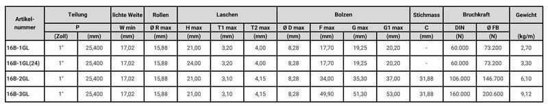 Abmessungen 16B-GL Rollenketten mit geraden Laschen
