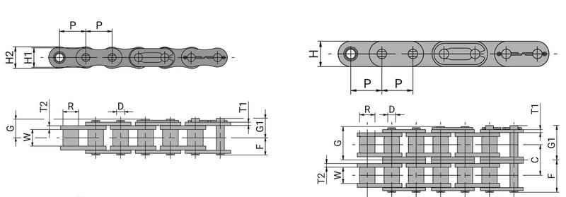 Hinweis: Diese Abmessungen entsprechen der ISO und können bei FB Hochleistungs-Rollenketten geringfügig abweichen. Bitte kontaktieren Sie die FB Kettenspezialisten für detailliertere Informationen.